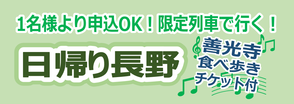 ・当プランの旅行代金は、往復(金沢~長野)北陸新幹線「限定列車(月曜~木曜日)」普通車指定席を基準としています。金沢駅以外や月曜~木曜日以外をご利用の場合、利用駅や曜日によって差額が発生いたします。