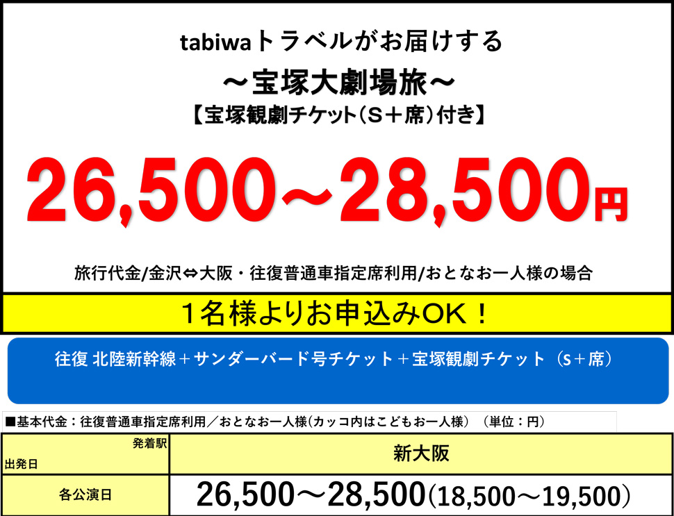 ・「通常列車」「限定列車」ともに利用列車が限られる日帰りプランとなります。当プランの旅行代金は、往復(金沢~大阪)北陸新幹線「限定列車」普通車指定席を基準としています。金沢駅以外をご利用の場合、差額が発生いたします。