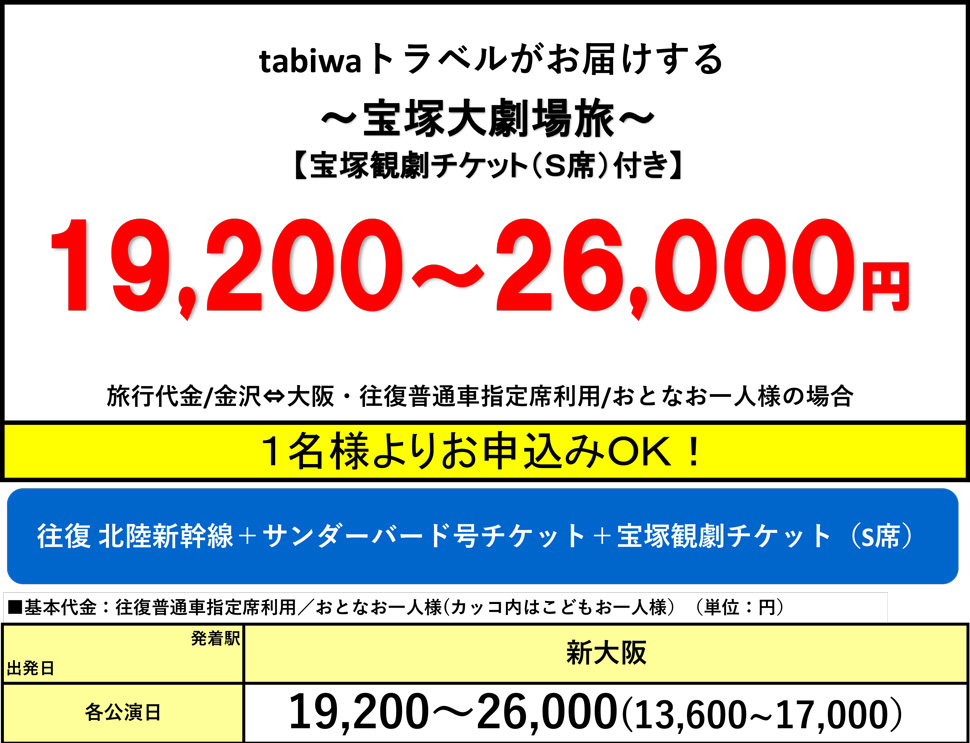 ・「通常列車」「限定列車」ともに利用列車が限られる日帰りプランとなります。当プランの旅行代金は、往復(金沢~大阪)北陸新幹線「限定列車」普通車指定席を基準としています。金沢駅以外をご利用の場合、差額が発生いたします。