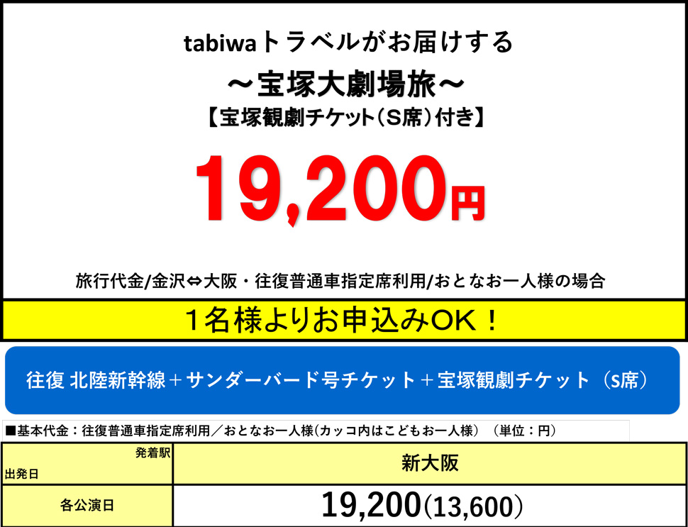 ・「通常列車」「限定列車」ともに利用列車が限られる日帰りプランとなります。当プランの旅行代金は、往復(金沢~大阪)北陸新幹線「限定列車」普通車指定席を基準としています。金沢駅以外をご利用の場合、差額が発生いたします。