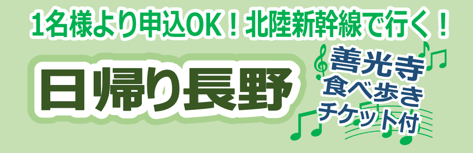 ・当プランの旅行代金は、往復(金沢~長野)北陸新幹線「限定列車(平日)」普通車指定席を基準としています。金沢駅・平日以外をご利用の場合、利用駅や曜日によって差額が発生いたします。