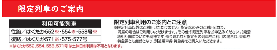 ※「限定列車」とは、「列車限定」・「座席数限定」となります。「限定列車」は選択した列車の指定席に限り有効です。指定の列車に乗り遅れた場合、乗車券・特急券とも無効となり、後続の自由席もご乗車いただけません。お客様都合で乗り遅れた場合、すでにお持ちの乗車券・特急券について払い戻しはできません。