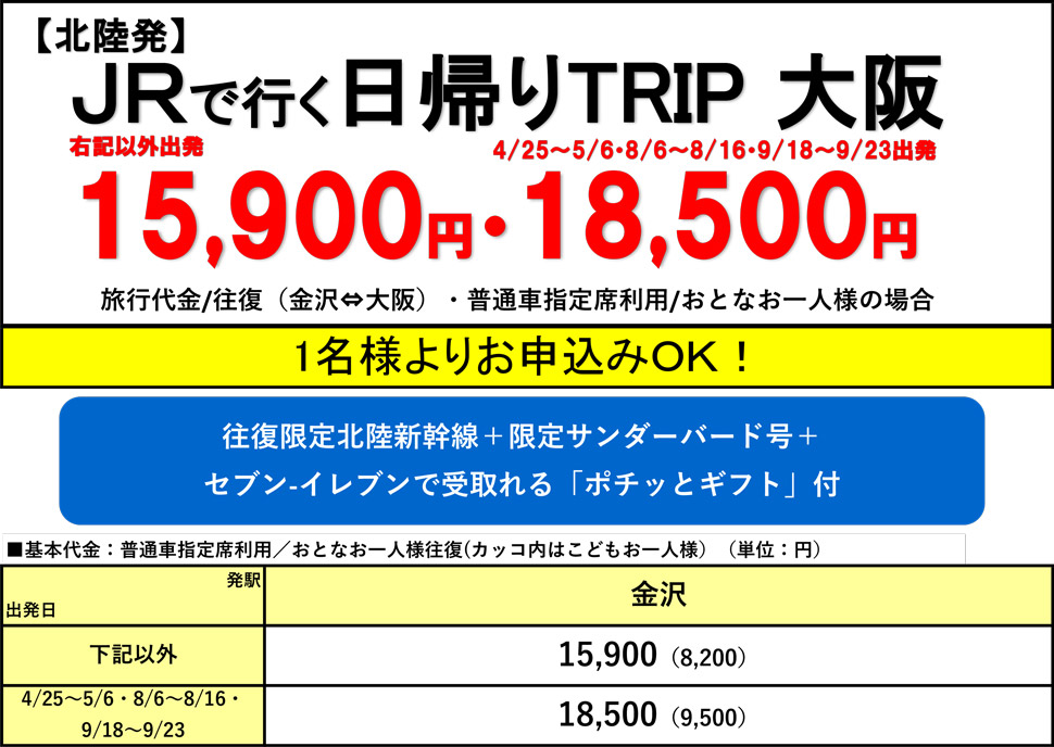 【tabiwaトラベル/WESTER会員限定】日帰りJRで行こう大阪(1名様よりお申込みOK)