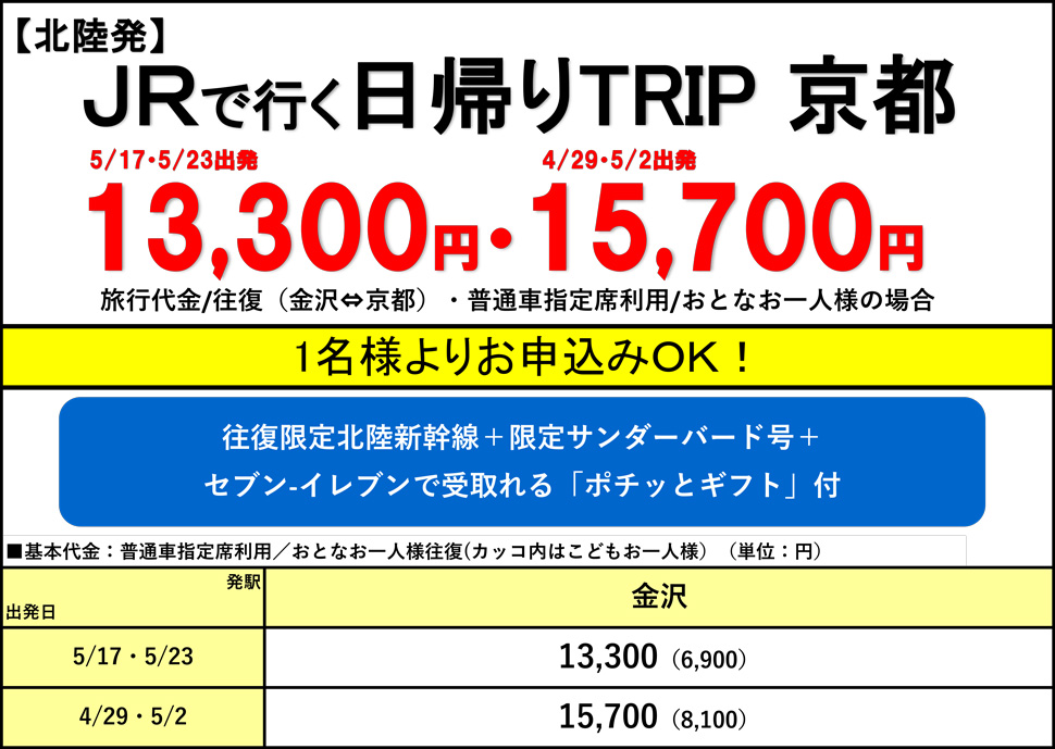 【tabiwaトラベル/WESTER会員限定】日帰りJRで行こう京都(1名様よりお申込みOK)