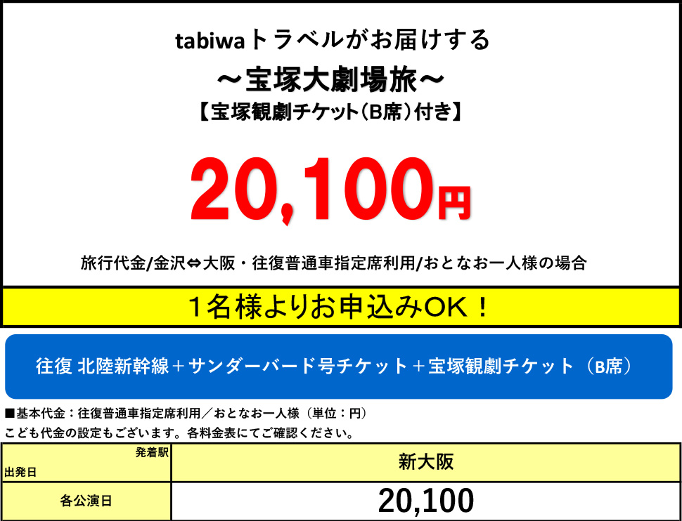 【tabiwaトラベル/WESTER会員限定】1名様からご利用OK♪JR限定列車で行く!日帰りプラン★宝塚大劇場旅 観劇チケット付き(B席)