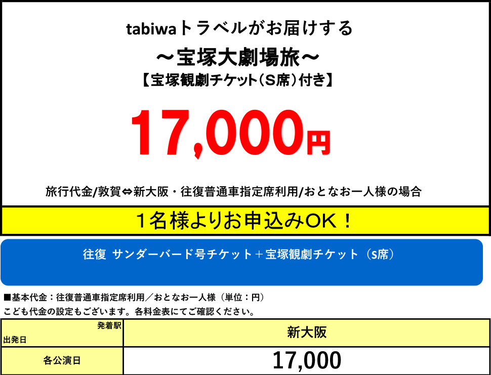 【tabiwaトラベル/WESTER会員限定】1名様からご利用OK♪JR限定列車で行く!日帰りプラン★宝塚大劇場旅 観劇チケット付き(S席)(敦賀駅)