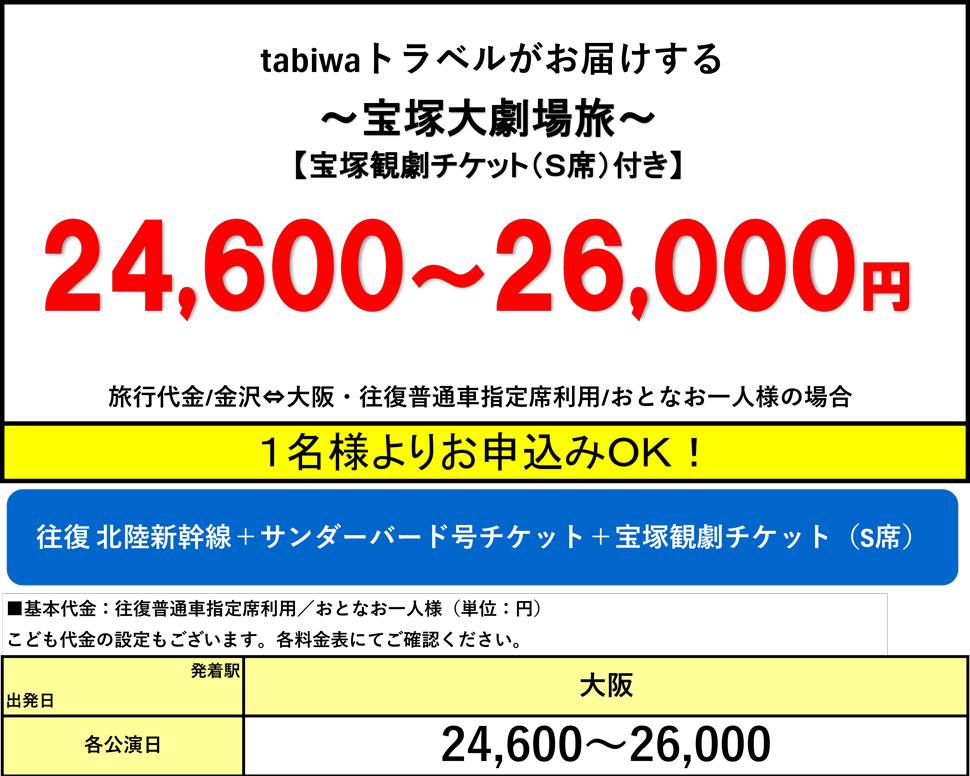 【tabiwaトラベル/WESTER会員限定】1名様からご利用OK♪JR限定列車で行く!日帰りプラン★宝塚大劇場旅 観劇チケット付き(S席)