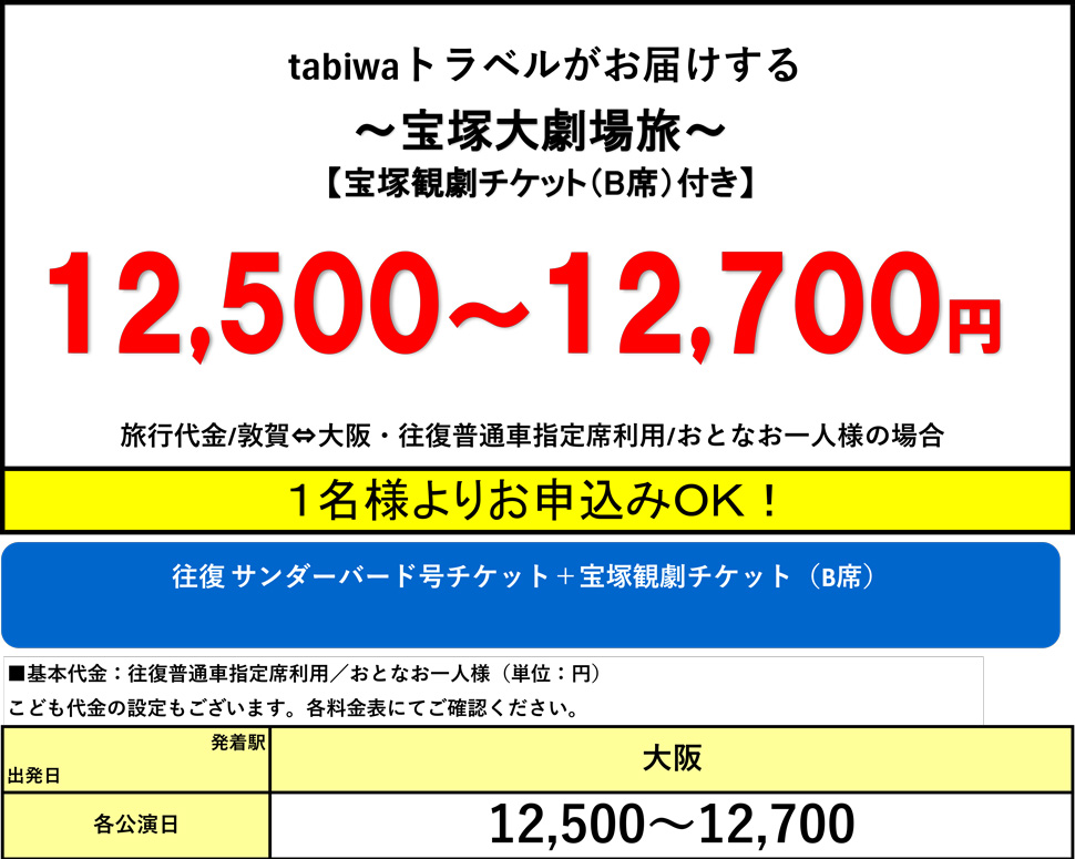 【tabiwaトラベル/WESTER会員限定】1名様からご利用OK♪JR限定列車で行く!日帰りプラン★宝塚大劇場旅 観劇チケット付き(B席)(敦賀駅)