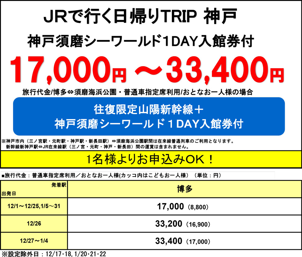※神戸須磨シーワールド1DAY入館券は旅行代金に含まれます。