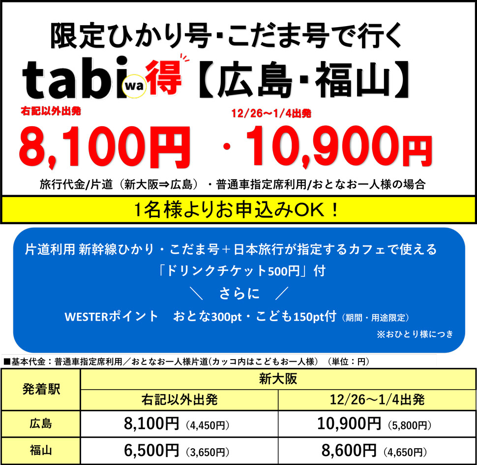 【tabiwaトラベル/WESTER会員限定】【tabiwa得】山陽新幹線ひかり・こだま限定プラン 広島・福山