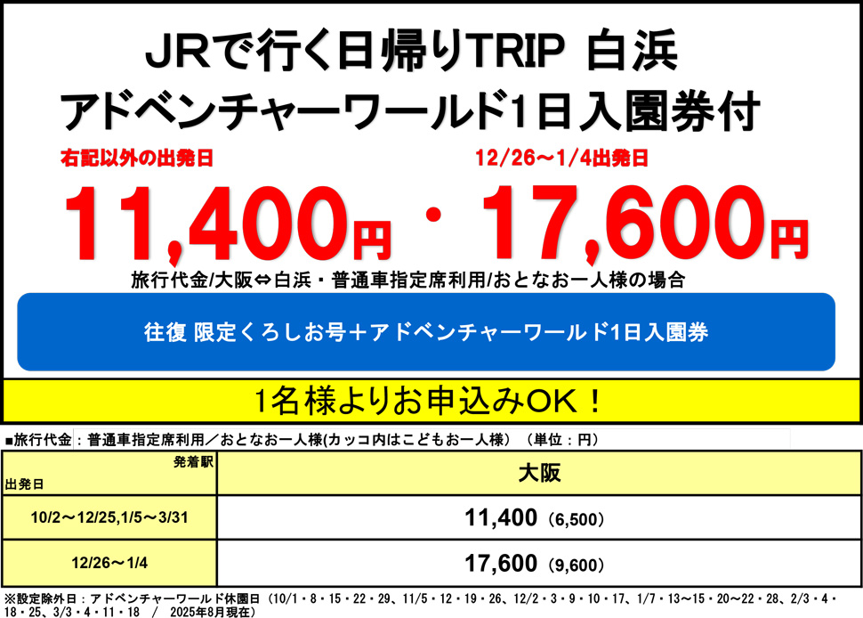 (JR白浜駅⇔アドベンチャーワールド間の交通費は旅行代金に含まれません)