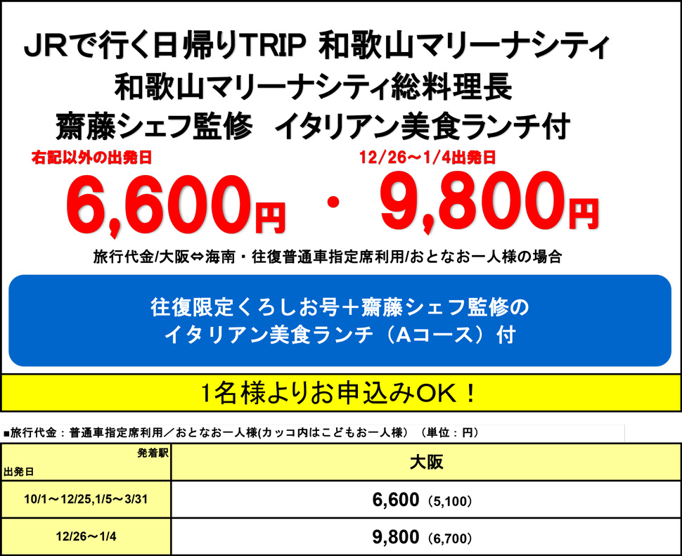(JR海南駅⇔マリーナシティ間の交通費は旅行代金に含まれません)