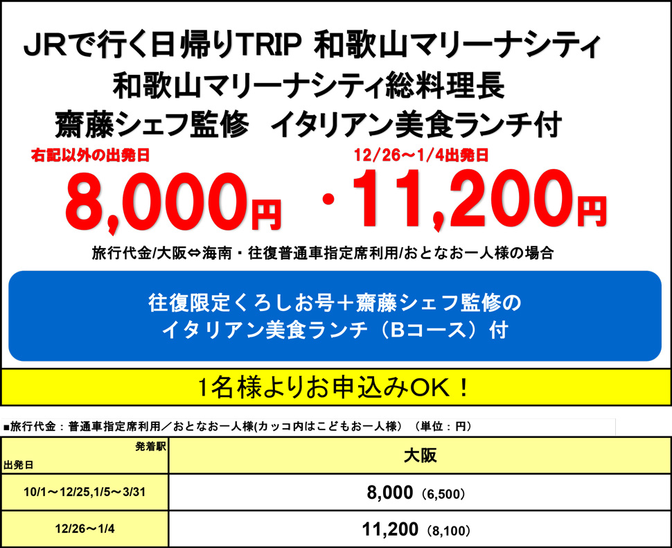 (JR海南駅⇔マリーナシティ間の交通費は旅行代金に含まれません)