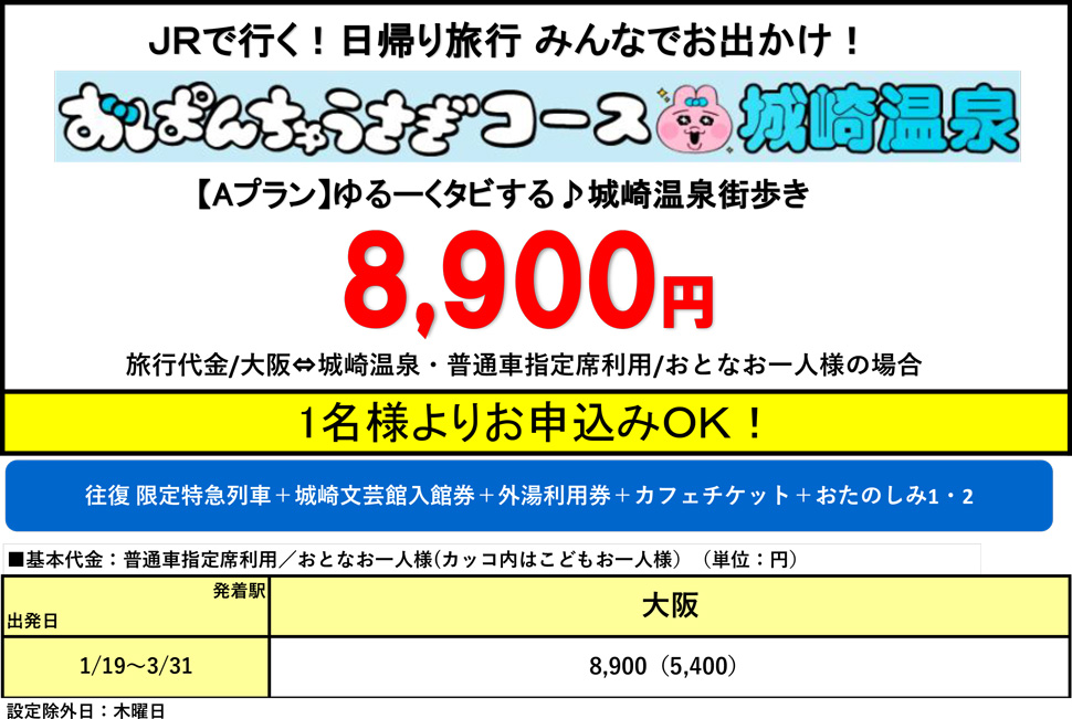 ※城崎文芸館入館券・外湯めぐり券・CAFEクーポン・お楽しみガチャはご旅行代金に含まれます。