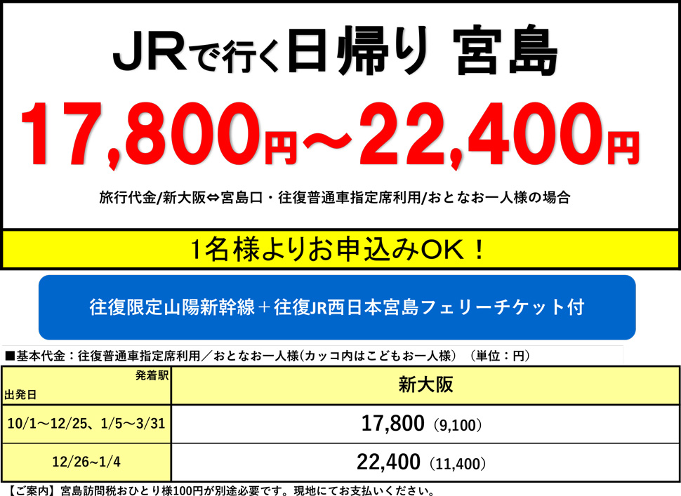 ※往復JR西日本宮島フェリーチケットは旅行代金に含まれます。
