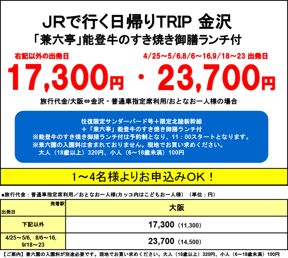 ■■兼六園の入園料は旅行代金に含まれておりません。現地で入園券をお買い求めください。■■