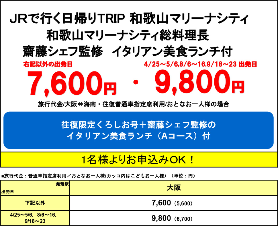 (JR海南駅⇔マリーナシティ間の交通費は旅行代金に含まれません)
