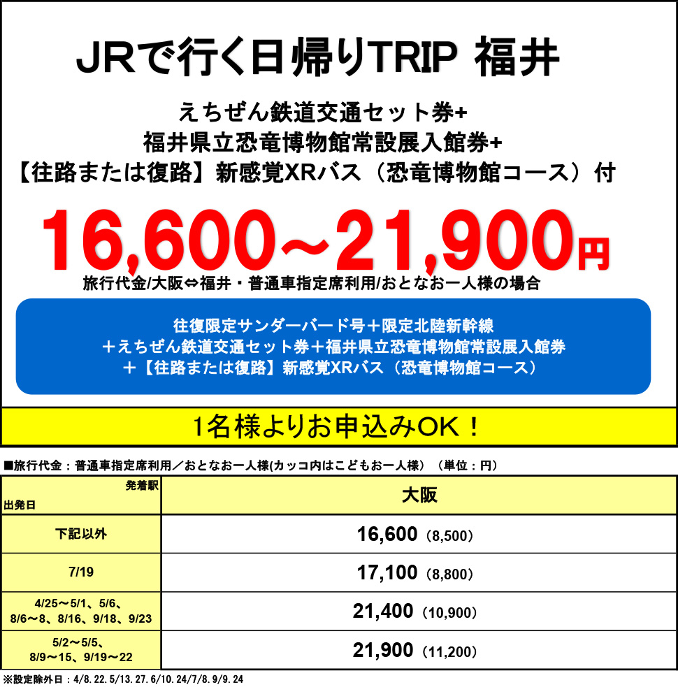 ※恐竜博物館用交通セット券はご旅行代金に含まれます。ご利用にならなかった場合でも、返金や払い戻しはありません。