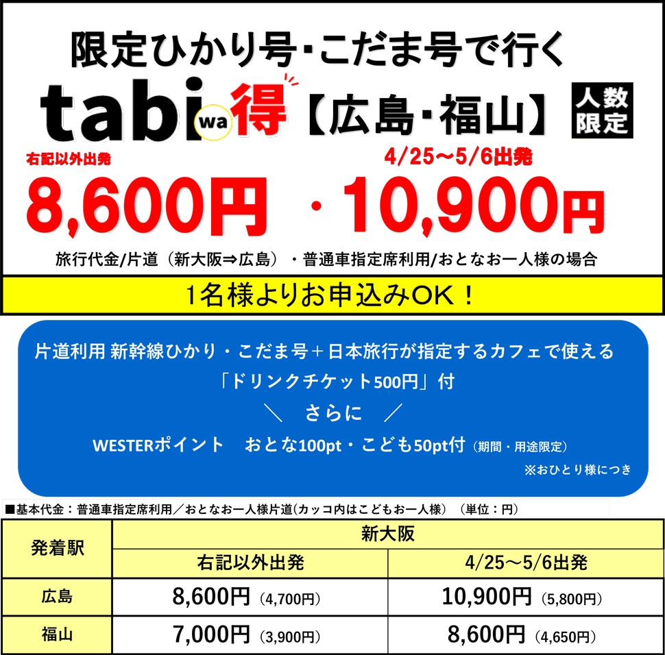 【tabiwaトラベル/WESTER会員限定】【tabiwa得】山陽新幹線ひかり・こだま人数限定プラン 広島・福山
