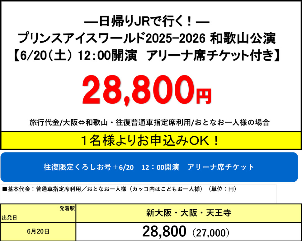 ★プリンスアイスワールド和歌山公演のチケット+関西発往復JRがセットになった日帰りプランです。