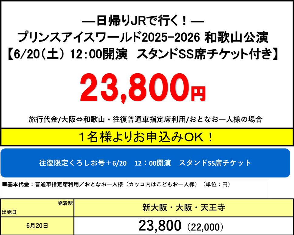 ★プリンスアイスワールド和歌山公演のチケット+関西発往復JRがセットになった日帰りプランです。