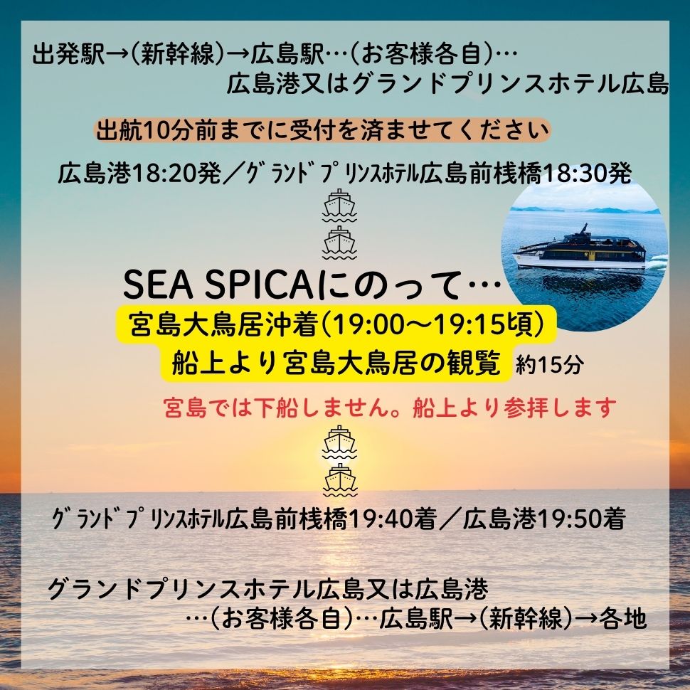 ※広島駅⇔広島港、グランドプリンスホテル広島前桟橋間の交通費は、お客様負担となります。