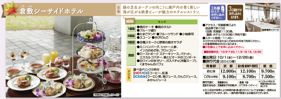 児島駅東口より送迎車で約10分(往路:児島駅11:30発、復路:ホテル13:30発)(予約不要)