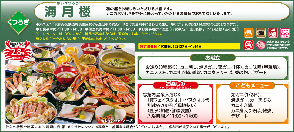 <アクセス>京都丹後鉄道丹後由良駅から送迎車で約3分(ゆきは到着列車に合わせて送迎、帰りは13:20頃又は14:00頃の出発となります。)(予約不要)