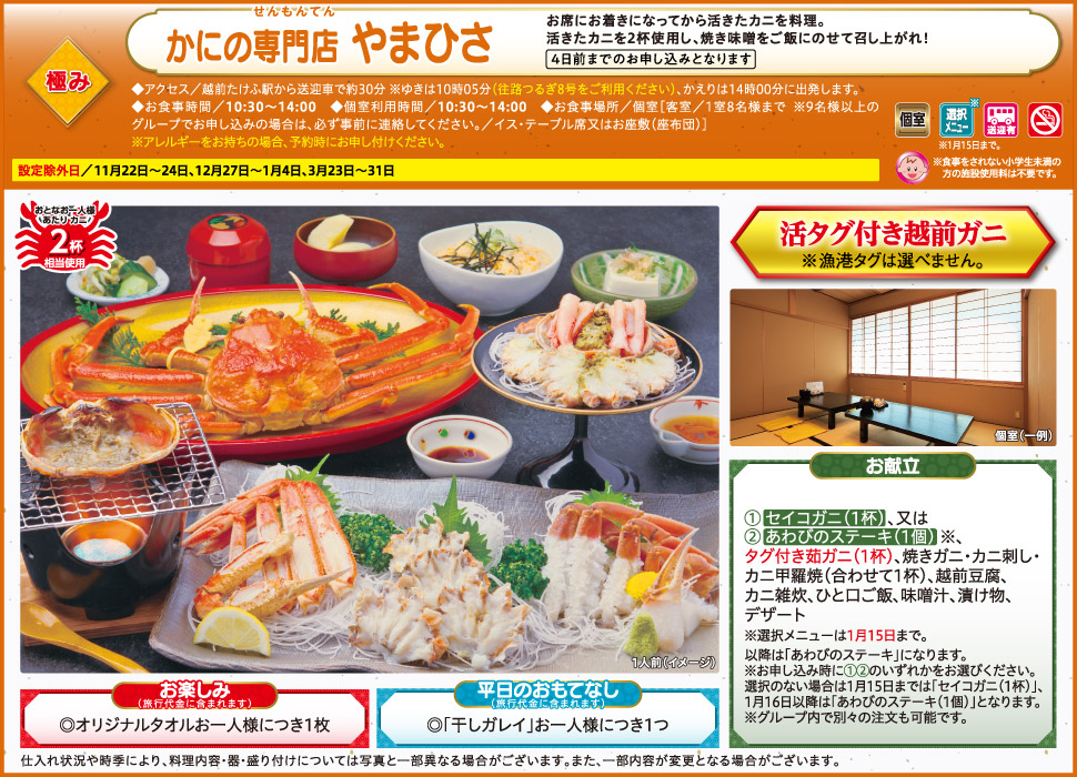 【tabiwaトラベル/WESTER会員限定】かにカニ日帰りエクスプレス北陸【越前海岸】カニ専門店やまひさ あわびのステーキ1個付<極み>