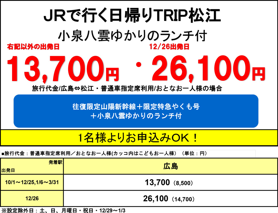 ※松江発の日帰り行程でご予約いただいた場合は、お取消させていただく場合がございます。