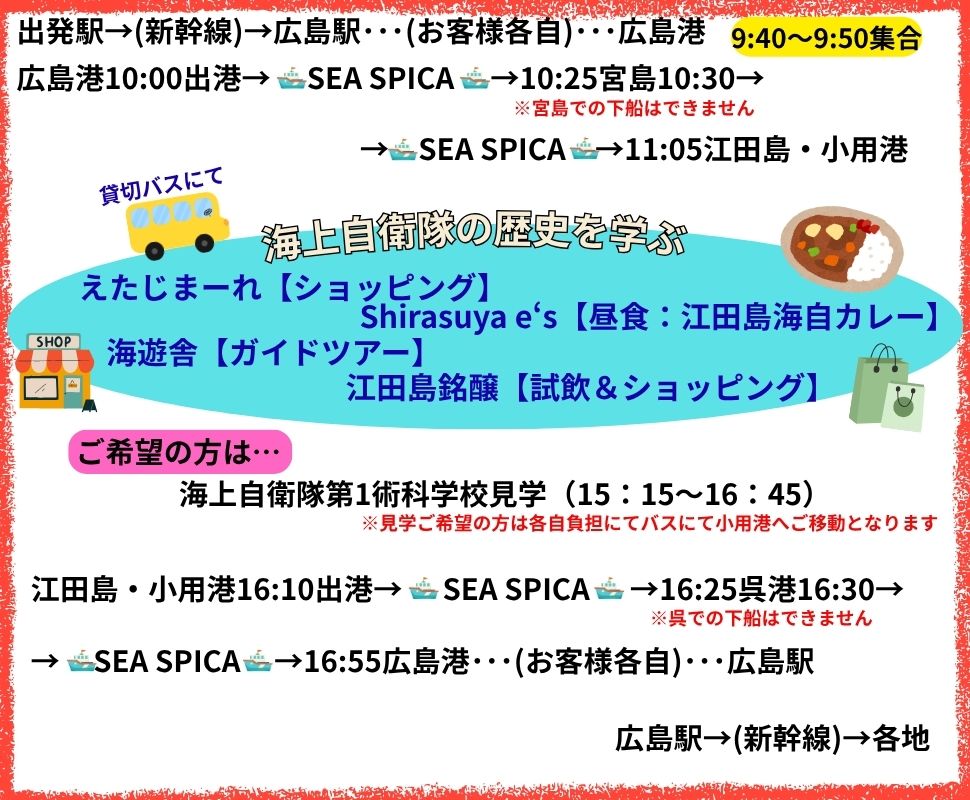 2025年12月14日(日) 広島港を10:00に出港し、江田島の海遊舎や江田島銘醸など海上自衛隊ゆかりの地を巡ります。