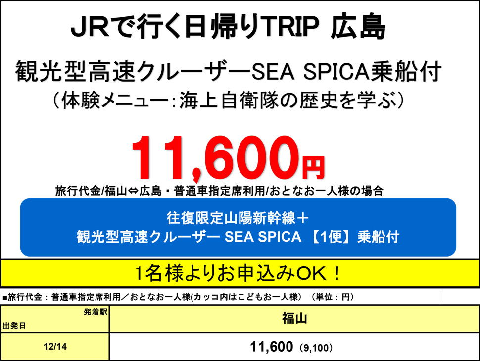 ※往復新幹線、乗船代、貸切バス、ガイドツアー代、昼食代はご旅行代金に含まれます。(広島駅↔広島港までの交通費は含まれておりません)