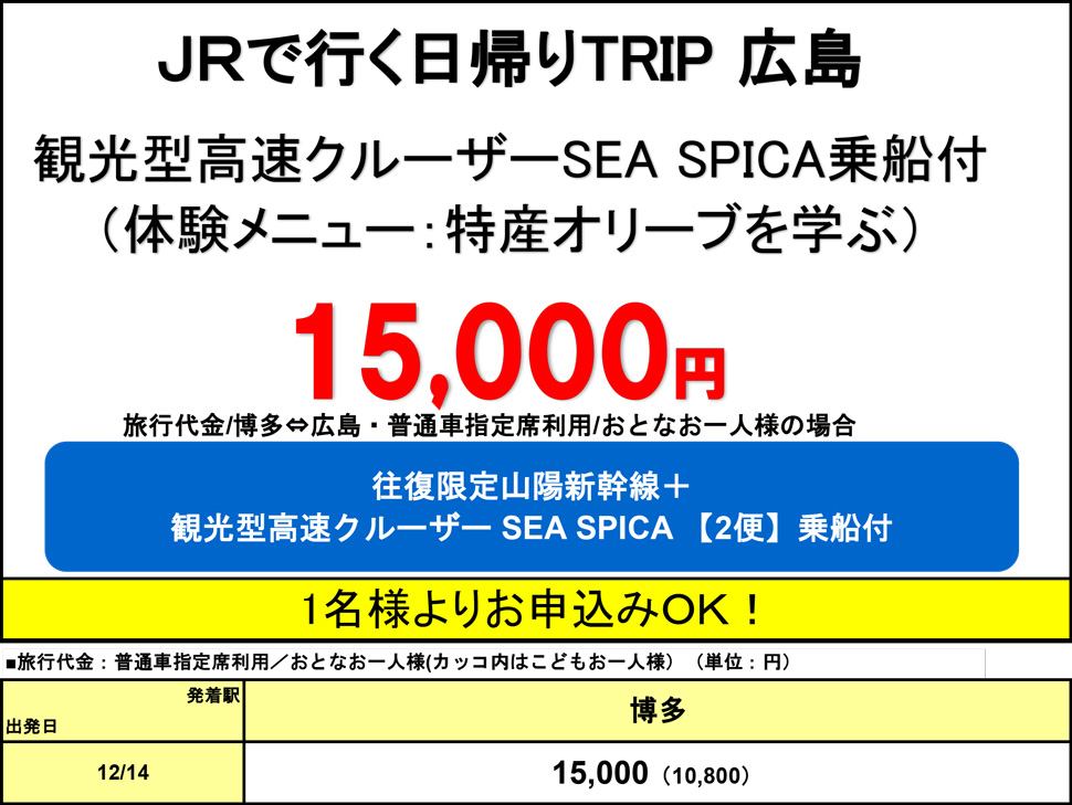 ※往復新幹線、乗船代、貸切バス、講座代、見学代、お土産はご旅行代金に含まれます。(広島駅↔広島港までの交通費・昼食代は含まれておりません)