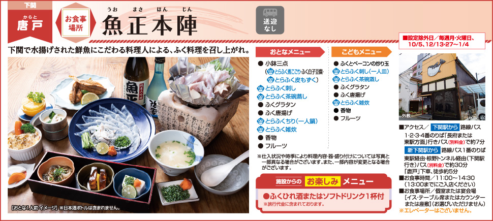 魚正本陣・春帆楼・平家茶屋へは新下関駅より路線バス(別料金)をご利用ください。