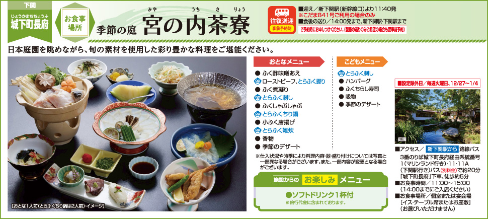 魚政本陣・春帆楼・平家茶屋へは新下関駅より路線バス(別料金)をご利用ください。