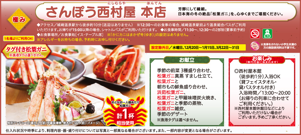 <アクセス>城崎温泉駅から徒歩約10分(送迎はありません) ※12:30~のお食事の場合、城崎温泉駅前より温泉組合バスがご利用いただけます。お帰りが15:00以降の場合、シャトルバスがご利用いただけます。