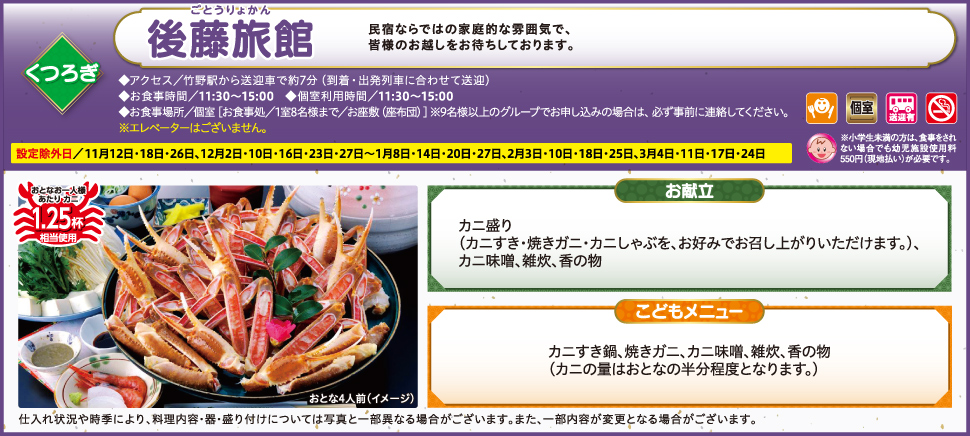【tabiwaトラベル/WESTER会員限定】かにカニ日帰りエクスプレス北近畿【竹野】後藤旅館<くつろぎ3~8名>