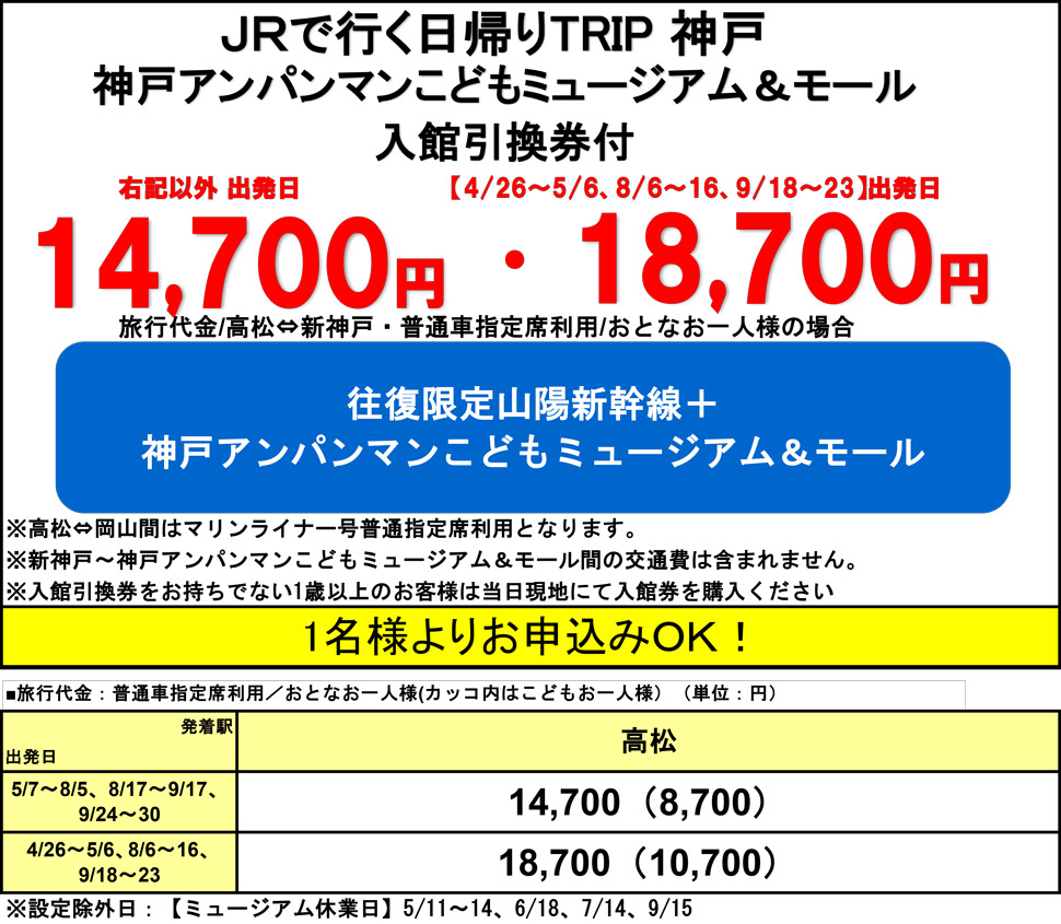 ※ご旅行代金には、往復JR券と神戸アンパンマンこどもミュージアム&モール入館引換券が含まれています。ご利用にならない場合の返金はありません。