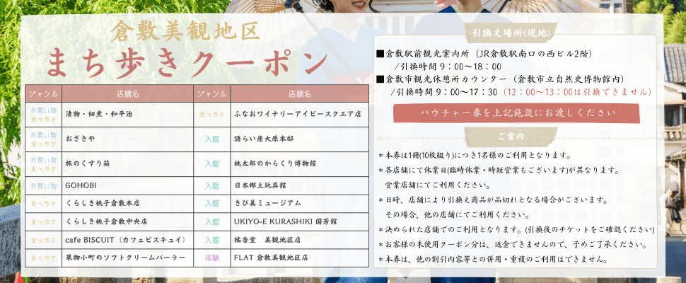 倉敷美観地区の店舗・入場施設で使えるお得なクーポンです。