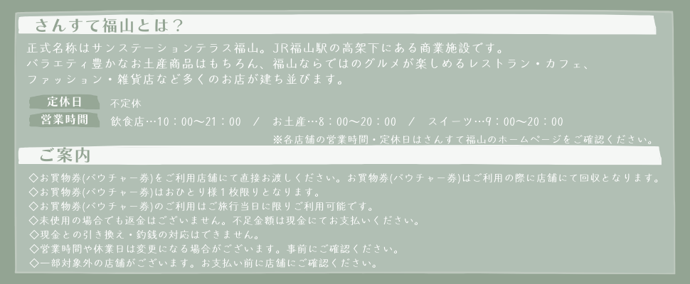 ※「さんすて福山」のお買物券は旅行代金に含まれます。